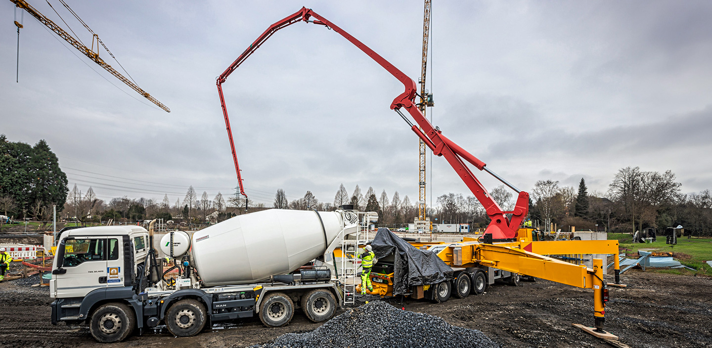 Unter Pumpbeton versteht man Frischbeton, der mithilfe von Betonpumpen zur Einbaustelle gefördert wird. Diese Förderung von Beton direkt vom Fahrmischer in die Schalung ist oft deutlich schneller als der konventionelle Einbau. Das bedeutet unter anderem: kurze Einbauzeiten bei geringem Personaleinsatz. Das reduziert die Kosten. Ob „Normalfall“, enge Grundstücksverhältnisse oder schwierige architektonische Geometrien: Betonpumpen bieten für fast alle Einsatzzwecke die geeignete Lösung. Neben der schnelleren Betonage und der guten Verarbeitbarkeit des Betons kommt beim Pumpen ein weiterer Vorteil zum Tragen: Der Frischbeton läuft ohne Unterbrechung in die Schalung.